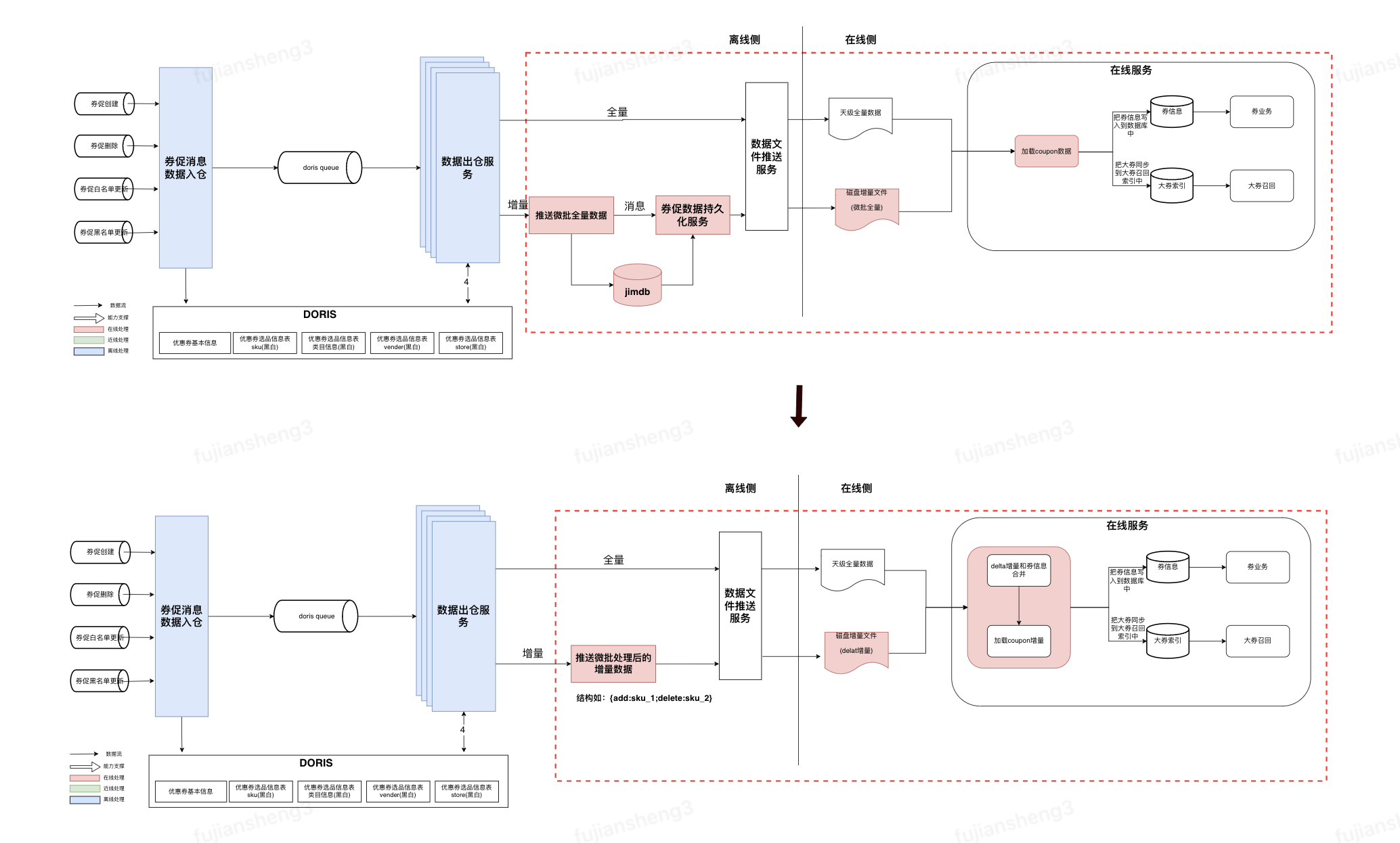 随着业务发展业务侧提出了更高时效性要求,微批全量出仓方案已经无法满足业务发展需求,同时在线端磁盘使用问题也急需解决,需要升级为纯流式增量处理方式。